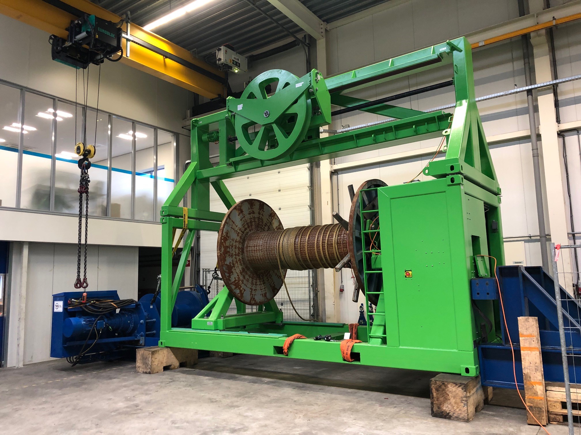This spooling machine will be applied on board of Deme’s Spartacus for rewinding the winches with new steel cables under the right pre-tension. Because of the special design, the cable can leave the machine at several locations so all ships winches can be reached while the machine itself can remain in 1 fixed location.