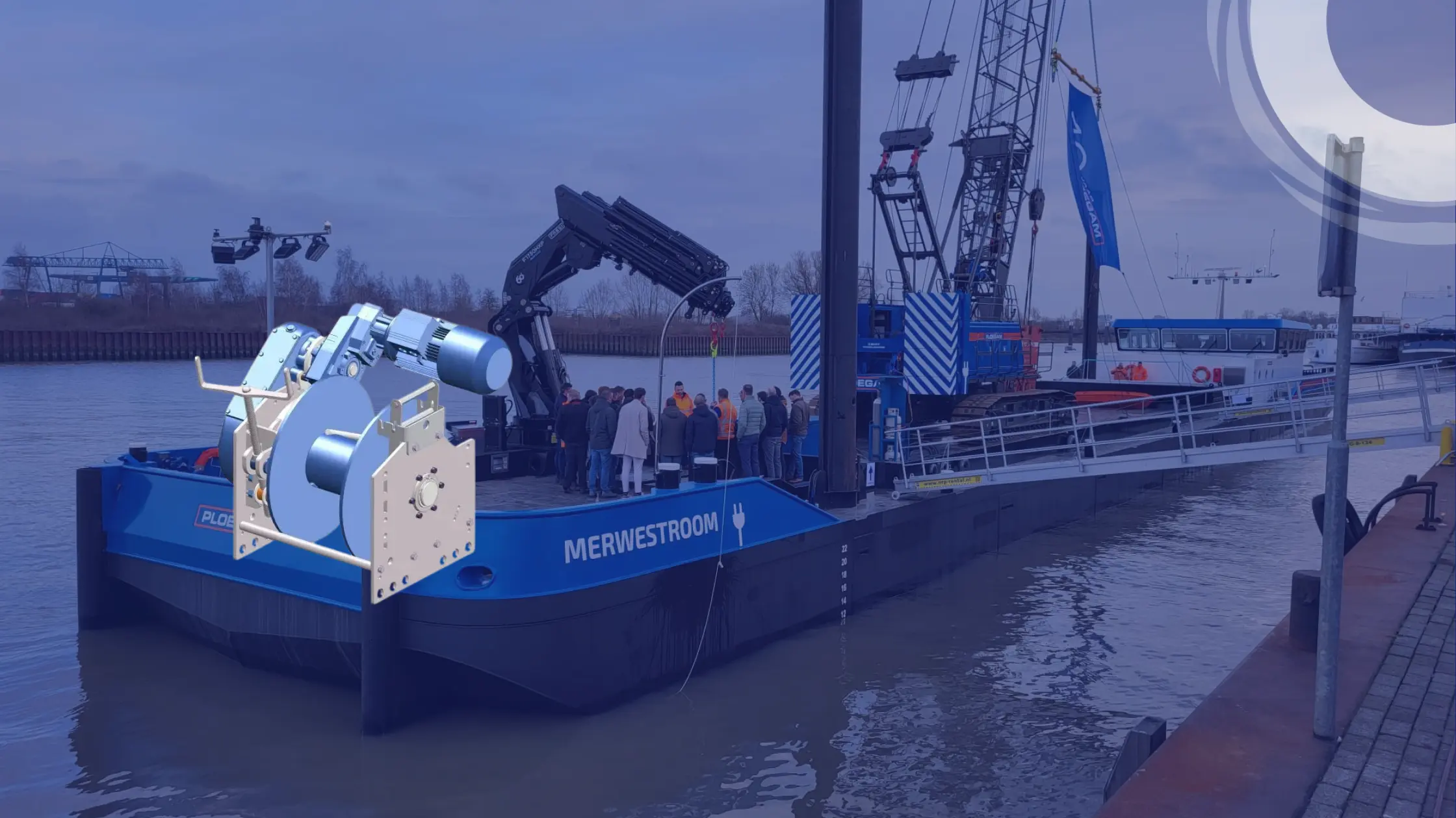 The vessel will be deployed for work on hydraulic engineering projects, bridges, and locks. It is also used for loading and unloading construction materials. The Merwestroom is equipped with its own onboard battery system, and additional battery packs are used to power the electric crane.